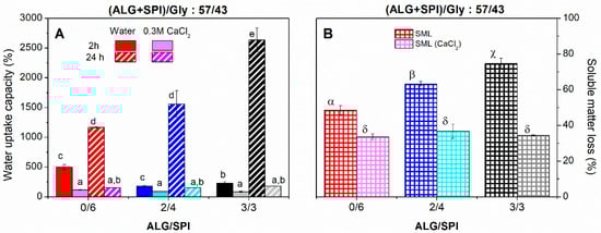 Water uptake capacity after 2 and 24 h of water or CaCl2 solution (0.3 M) immersion (A) and soluble matter loss (B) of alginate + soy protein isolate/glycerol composites with ALG/SPI ratios: 0/6, 2/4, and 3/3, maintaining the ALG + SPI/Gly ratio: 57/43. Lower-case, upper-case, and Greek letters indicate that average values are statistically different (p < 0.05).