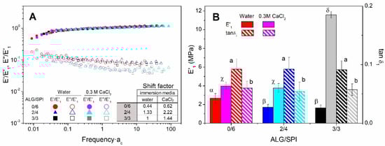 Factorized mechanical spectra of the viscoelastic moduli of alginate + soy protein isolate/glycerol matrices with ALG/SPI ratios: 0/6, 2/4, and 3/3, keeping the ALG + SPI/Gly ratio at 57/43. Freeze-dried matrices were obtained after immersion in water or a 0.3 M CaCl2 solution (A). Elastic moduli and loss tangent of samples obtained at 1 Hz (B). Lower-case, upper-case, and Greek letters indicate that average values are statistically different (p < 0.05).