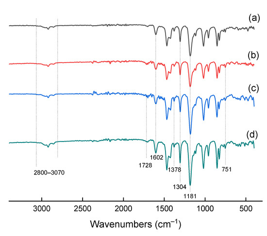 Figure 4 shows the FTIR spectra of pristine PPO and hybrid membranes. The spectra of IL-PPO, HSM-PPO, and (HSM:IL)-PPO composites practically repeat the analogous spectra of pure PPO in the range of 500–1610 cm−1. The characteristic absorption bands of the phenyl group of PPO appear at approximately 1600 and 1470 cm−1, which corresponds to the stretching vibrations C=C and C–H of the benzene ring, respectively. Absorption at 1181 and 1304 cm−1 refers to symmetric and asymmetric stretching vibrations of the C–O bond. The spectra range from 2800 to 3200 cm−1 is the range of stretching vibrations of C–H. The bands at 3082, 3060, and 3026 cm−1 correspond to absorptions from stretching vibrations of aromatic C–H, while the absorption bands at 2923 and 2848 cm−1 originate, respectively, from asymmetric and symmetric stretching vibrations of methylene groups –CH2. As can be seen from the comparison of spectra 1–4 (Figure 4), when the components of the modifier are included in the PPO matrix, there are no noticeable changes in the position and intensity of the absorption bands. This may indicate only very weak interactions between the matrix polymer and modifying agents, which are not fixed due to a very low concentration of the modifier, or the absence of such interactions.