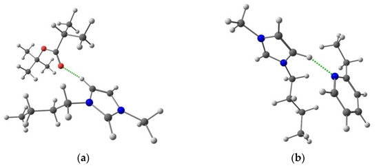 For a more detailed investigation of the influence of modifiers on transport properties, quantum chemical calculations were used. Based on quantum chemical calculations, the heat effects of chemical reactions were obtained as the difference between the corresponding thermodynamic functions of associates and reagents. As can be seen from Table S1, when considering the interaction of IL components with the fragments of the HSM polymer chains, the coordination between IL and the star macromolecule occurs mainly due to the interaction of the IL cation and diblock copolymer (P2VP-block-PTBMA) (Figure 11).