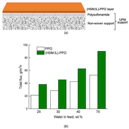 Scheme of (a) thin film composite membrane and (b) total flux through PPO/UPM and (HSM:IL)-PPO/UPM composite membranes as a function of water concentration in the feed in pervaporation of water‒lactic acid mixture, 20 °C.