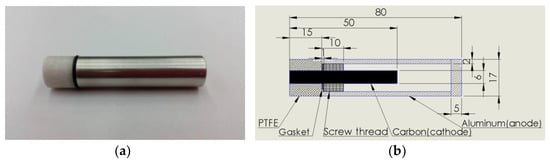 Figure 1 demonstrates that the novel TEP adopts materials including polytetrafluoroethylene (PTFE), Viton rubber (Gasket), carbon, and aluminum. The carbon rod and the aluminum tube with good thermal conductivities are respectively used as the cathode and the anode. In the insight design, the aluminum and carbon are insulated with PTFE and gaskets to avoid short circuits. Afterwards, the ionic compounds and the nanofluids possessing good thermal conductivity were filled into the tube as the electrolytes, which had four types, involving titanium oxide nanofluid, deionized water, surface seawater, and polymeric nanofluids composed of nanoparticles added to sodium hydroxide (NaOH). When the tubular electrode (aluminum tube) and the core rod (carbon rod) electrode have a temperature difference, thermal energy can be directly converted into electric energy by the redox reaction of the electrolytes (four kinds), and the electrodes can generate electromotive force. In particular, the novel PET device may use the structural design between the tubular electrode and the core rod electrode to provide a greater contact area with a heat source, and may be directly immersed in a heat source.