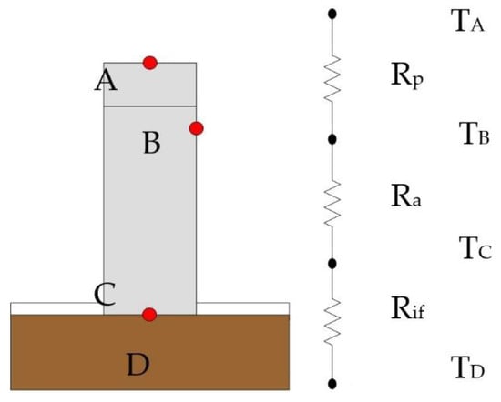 The present research mainly exploits the one-dimensional thermal resistance model [22] to evaluate the heat dissipation characteristics of the novel TEP, and the thermal resistance was used to judge the heat dissipation capacity. The larger the thermal resistance value was, the worse the heat dissipation effect was. The thermal resistance of the interface between the heat source and TEP was controlled between 0.05 and 0.09 °C/W. In addition, the thermal conductivity of the novel TEP was derived through the one-dimensional Fourier heat conduction equation. Thermoelectric performance experiments were carried out in different filling ratios of the novel TEP electrolyte, tube pressures, and electrolyte compositions, and thermocouples were employed to detect the heat transfer of the novel TEP under different temperatures. The temperature difference between the bottom and the top of the novel TEP was adopted to calculate the thermal resistance of the TEP, and then the thermal conductivity of the novel TEP was derived. The thermocouple measurement temperature points and thermal resistance analysis are shown in Figure 4. TA is the top surface temperature of TEP, TB is the side surface temperature of TEP, TC is the bottom surface temperature of TEP, and TD is the heating source temperature.