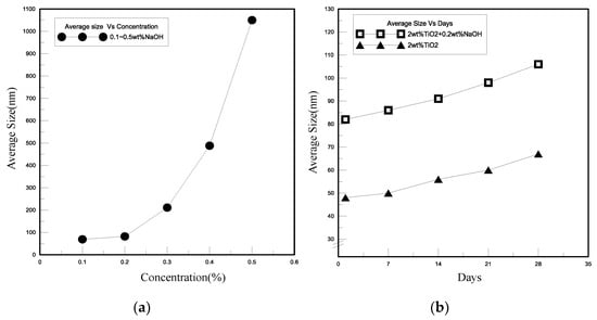 The effect of sodium hydroxide (NaOH) on titanium dioxide (TiO2) nanofluid. (a) Different concentrations of NaOH, (b) particle size.