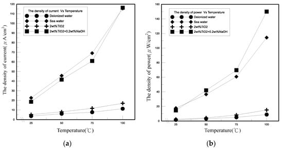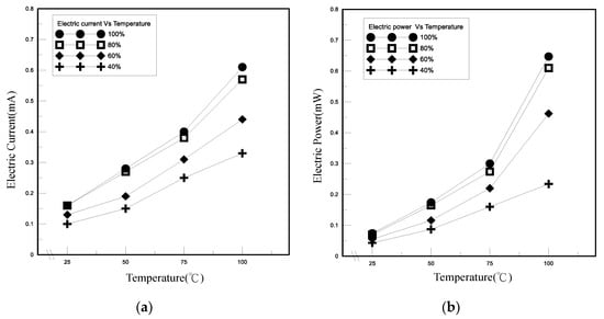 Relationship between electric performances and temperatures of different electrolytes of the novel TEP. (a) Current, (b) power.