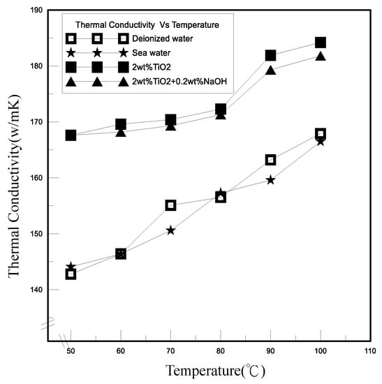 Figure 8 demonstrates the thermal conductivities with temperatures change of the novel TEP under various electrolytes, including the deionized water, seawater, titanium dioxide nanofluid, and polymeric nanofluid composed of titanium dioxide nanoparticles with sodium hydroxide. The thermal conductivity of TiO2 nanofluid was the best among these four solutions. The polymeric nanofluid composed of TiO2 nanoparticles added to NaOH affects the nanoparticle size, resulting in more serious agglomeration between the nanoparticles and the lower thermal conductivity of NaOH, so that its thermal conductivity tended to decrease more than TiO2 nanofluid. The difference of thermal conductivity coefficient between seawater and deionized water was not much different and their thermal conductivity coefficients were relatively poor. Compared with deionized water, the overall increase of thermal conductivity coefficient of the novel TEP containing TiO2 nanofluid was about 11%. The relationships between electric performances and temperatures of the novel TEP at different electrolytes are shown in the Figure 9. However, the effects of different electrolytes on the novel TEP could be seen in that the electric performances of the polymeric nanofluid was the highest among them, and the difference between seawater and the polymeric nanofluid was not much different. Compared with deionized water and TiO2 nanofluid from Figure 9a, the current density was relatively low. The overall increases in current density of TiO2 nanofluid and the polymeric nanofluid were respectively about 45% and 419%. Compared with deionized water and TiO2 nanofluid from Figure 9b, the power density was relatively low. The overall increases in power density of TiO2 nanofluid and the polymeric nanofluid were respectively about 55% and 768%.