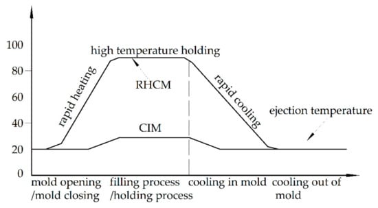 Some researchers have discussed the influences of the processing parameters on the warpage of CIM parts through experiments [8,9,10,11,12], and the warpage has been optimized based on experimental results [13,14,15,16,17]. These works have provided guidance to reduce the warpage of injection-molded parts. However, the guidance is usually not universal to all parts. The prediction of warpage by computer will solve the issue of universality. Some methods have been introduced and developed to predict the warpage of CIM parts [18,19,20], and some of them have been introduced into commercial software, such as Moldflow and Moldex 3D. The large warpage is considered as the main defect of RHCM parts [21]. Unlike the conventional injection molding (CIM) process, the RHCM process employs a dynamic mold temperature control strategy based on rapid mold heating and cooling [22]. In RHCM, the mold temperature is heated to a relatively high preset value before melt injection and remains constant during the filling and packing phases. On gate solidification, the mold is rapidly cooled to allow the solidification and the demolding of the polymer part [23], as shown in Figure 1. The different temperature histories in the mold introduce various thermal and shear histories to the polymer. Stratification is the most distinguishable feature in the inhomogeneous distribution of process parameters in molten polymer during molding and the microstructure in the molded parts after molding. The different crystal morphology of each layer introduces different mechanical properties. The layers with different mechanical properties will complicate the warpage of RHCM parts. The warpage prediction of RHCM parts is difficult because Moldflow cannot set multi-layer material and crystallinity. Therefore, it will be very meaningful to propose a prediction method to accurately predict the warpage of crystalline parts molded using the RHCM process.