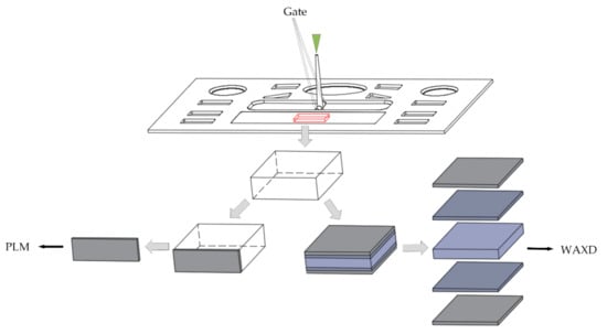 Samples with dimensions of 8 × 8 × 2.5 mm were taken from the center of the molded parts, as shown in Figure 3. The location was determined mainly by avoiding the weld mark. Thin slices of specimens were cut along the thickness direction of samples and observed using a polarizing microscope (U-FMP, Olympus Corporation, Tokyo, Japan). The thickness of each layer was investigated on the PLM results along the thickness direction.