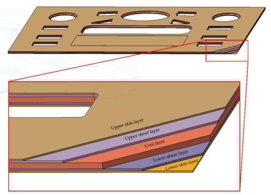 A multi-layer model was established to predict the warpage of injection-molded parts, because the stratification is the most distinguishable feature in the inhomogeneous distribution of process parameters in a molten polymer during molding and the microstructure in the molded parts after molding. In the model, the overall shape and dimensions were the same as those of the part. However, the model was divided into five layers along the thickness direction, namely the upper skin layer, upper shear layer, core layer, lower shear layer, and lower skin layer, as shown in Figure 4. The thicknesses of the layers in the model were the same as those of the parts.