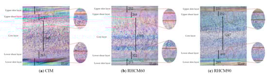 The thicknesses of the layers were obviously asymmetrical in the skin-core structures of the RHCM parts, introduced by the different temperatures between the stationary side and the moving side of the mold. Since the upper skin layer of the part was near the stationary side with heating rods, the thicknesses of the upper layers were smaller than those of the lower layers. The thicknesses of the upper skin layer and the lower skin layer in RHCM90 were 221 and 289 μm, respectively, a change by 30.8%. The thicknesses of the upper shear layer and the lower shear layer in RHCM90 were 252 and 491 μm, respectively, a change by 94.8%. The thickness variation in the upper and lower shear layers was three times greater than that in the upper and lower skin layers. The asymmetrical distribution of the layer thicknesses will introduce greater warpage.
