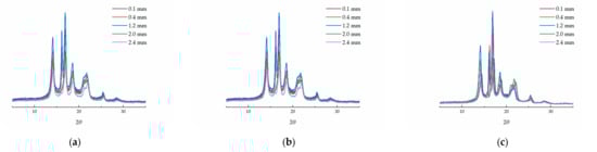 The position range of each layer in the molded parts was divided according to the crystal morphology observed in PLM. The distances x from the upper surface of the sample were set as the positions of certain layers to conduct the WAXD investigation, and 0.1, 0.4, 1.2, 2.0, and 2.4 mm were considered to be the positions of the upper skin layer, upper shear layer, core layer, lower shear layer, and lower skin layer, respectively. The crystallinity diffraction pattern of each layer obtained by WAXD is shown in Figure 6. The crystallinity of each layer could be calculated from the crystallinity diffraction pattern using X’Pert HighScore Plus. The calculated results of the crystallinities are shown in Table 2.