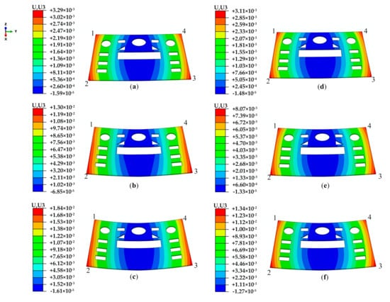 The multi-layer structures always appear in the molded parts along the thickness direction due to the inhomogeneous temperature history. The different crystal morphology of each layer introduces different mechanical properties. The layers with different mechanical properties will complicate the warpage of the part. Stratification is the most distinguishable feature in the inhomogeneous distribution of process parameters in molten polymer during molding and the microstructure in the molded parts after molding. However, the effect of stratification is ignored in the usual warpage simulation. The warpage prediction was conducted with and without the influence of crystallinity to verify the significance of the introduction of the model describing the elastic modulus with the influence of temperature and crystallinity. In the prediction without the influence of crystallinity, the elastic modulus was a function of temperature. The predicted results with different molding conditions are shown in Figure 8, where results with crystallinity are shown in Figure 8a–c and results without crystallinity are shown in Figure 8d–f. The maximum value of warpage appears very near to one of the corners of the parts. Numbers 1, 2, 3, and 4 are used to mark the different corners for further discussion.