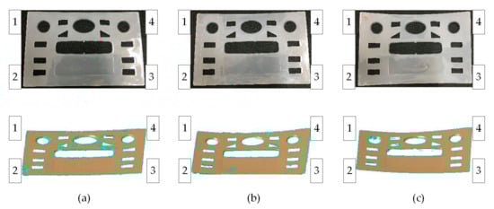 Warpage information of real parts measured by a 3D laser scanner under different molding conditions: (a) CIM, (b) RHCM60, (c) RHCM90.
