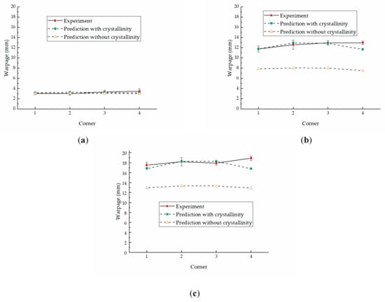 The maximum values of warpage are shown in Figure 10, including the data of experiments and predictions with crystallinity and without crystallinity. The predicted warpage with crystallinity is much closer to the experimental warpage. The average errors of the four corners between the predicted warpage and average experimental warpage are 0.23, 0.44, and 0.81 mm, respectively, in CIM, RHCM60, and RHCM90, with respective deviations of 7.0%, 3.5%, and 4.4%. The maximum errors are 0.35, 1.30, and 2.12 mm, respectively, with deviations of 10.1%, 10.0%, and 11.2%. The difference is mainly due to the crystallinity of each layer in the simulation. The crystallinities of each layer in the model were obtained by measuring the corresponding positions of molded parts with WAXD. However, the crystallinity measured with WAXD cannot accurately represent the actual crystallinity of the layer. In addition, experimental errors, characterization errors, etc., which have an impact on the distribution of the model’s multiple layers and the mechanical properties of each layer during warpage prediction.