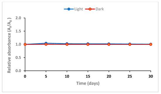 Post-irradiation stability of PVANBT films stored in dark and light at room temperature, λmax = 430 nm.