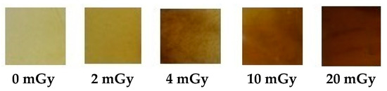 The exposure of film nanocomposite samples of PVA dopped NBT to X-irradiation from 0 to 20 mGy resulted in a clear change in color even with low doses (Figure 2). The change in color, from transparent colorless for PVA film to clear yellow for unirradiated PVA/NBT and to yellowish-brown gradually after X-irradiation, confirmed the high sensitivity of the made nanocomposite films to low radiation doses (at the mGy scale). The formation of hydrazine due to the reduction of the formazan may be the consequence of the change in color of the films [45,46]. The further studies presented in the following will show the effect of X-irradiation on other parameters.
