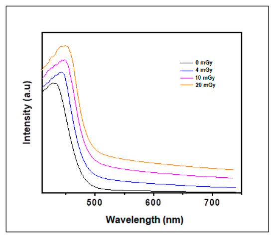 Figure 3 presents the UV-vis absorption spectra of both PVA control film and those irradiated with the different X-ray doses. In the case of the PVA film which is transparent and colorless, there is no absorption peak in the visible region. The film is seen to become yellowish-brown gradually after X-irradiation. Results in Figure 3 show one sharp band with maximum absorption at 430 nm. The absorption capacity of these bands increased according to the augmentation of the applied doses. The gradual increase noted in the broadening peak with the absorbed dose is related to the reduction of NBT2+ to mono-formazan (MF+) then to a stable hydrophobic di-formazan (DF) structure under the effect of the applied irradiation [47,48]. The region of maximum absorption is violet/blue in color which is ascribed to yellow/orange as a complementary color. Therefore, the visual observation in color change presented previously is confirmed via the UV-spectroscopic analysis by observation of the absorption peak at 430 nm. Furthermore, the absorption maximum was shifted gradually with the increasing dose from 430 to 450 nm (in the case of 20 mGy dose). This was probably due to the more pronounced reduction of formazan for the NBT and the appearance of the di-formazan product.