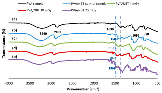 As explained above, the effect of the applied irradiation could be assigned by the transformation of the formazan structure to the other reduced structures. FTIR spectroscopy characteristics for formazans are the C=N, N–H and N=N absorption bands. Possible open structures after reduction show higher frequencies for these bands, due to the loss of resonance stabilization of the six-membered chelate ring. Figure 5 shows the different FTIR spectra of PVA, unirradiated PAV/NBT and irradiated PVA/NBT films with various X-ray doses. A characteristic infrared spectrum for PVA casted film is presented in Figure 5.