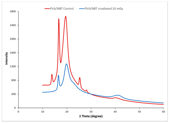 The X-irradiation effect could be confirmed by the detection of induced changes in the crystallinity of PVA/NBT composite films. X-ray diffraction analysis was performed to evaluate the changes in crystallinity illustrated in the XRD patterns before and after x-radiation exposure of the made films to different doses. Figure 6 shows X-ray diffractograms for control and X-irradiated PVA/NBT nanocomposite films at various doses. Control PVA/NBT film exhibited a typical peak centered at 2θ = 19°, which is ascribed to diffraction from a mixture of planes (101) and () [58]. XRD patterns showed a significant decrease of the peak intensity at 2θ = 19° from control to X-irradiated films with 20 mGy. Furthermore, the results revealed the presence of two characteristic peaks on the diffractogram of the control film at 2θ = 14 and 17°. These peaks were assigned to the diffraction from (100) and ) planes of PVA. We remarked on the disappearance of the two last-mentioned peaks after the X-irradiation of the PVA/NBT film. The peak at 2θ = 41.06° also corresponds to the PVA crystalline phase [59]. The different recorded changes in the intensity of the various peaks reveal that a structural rearrangement occurred after irradiation.