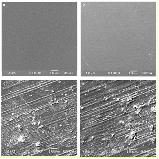 Scanning electron microscopy (SEM) morphologies of pure PVA film (a), unirradiated PVA/NBT (b) and irradiated PVA/NBT films with 10 mGy (c) and 20 mGy (d).