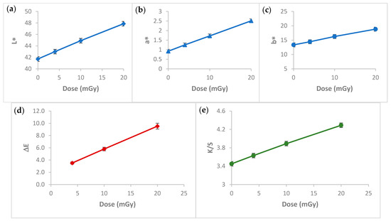 Hunter’s color parameters: (a) lightness L*, (b) redness-greenness axis a*, (c) yellowness-blueness axis b*, (d) total color difference ΔE and (e) color strength K/S values for PVA/NBT films irradiated from 4 to 20 mGy.