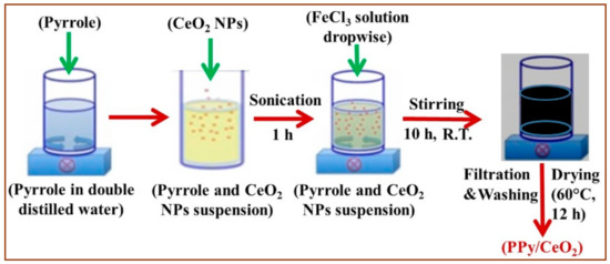 An identical procedure was adopted to synthesize the PPy/CeO2. First of all, 0.03 mol of pyrrole was agitated in 100 mL of double-distilled water. Then, 500 mg of CeO2 NPs were transferred into the above aqueous suspension of pyrrole. Then, pyrrole and CeO2 NPs suspension were ultrasonicated for 1 h intended for the adsorption of pyrrole molecules on the surface of CeO2 NPs. After that, FeCl3 solution was added dropwise to the aqueous suspension of pyrrole and CeO2 NPs during continuous stirring condition at room temperature for 10 h, which produced a black colored slurry of PPy/CeO2. Thus, prepared slurry of PPy/CeO2 was filtered with continuous washing with double-distilled water and methanol. Thus, produced black colored PPy/CeO2 was dried in an air oven at 60 °C for 12 h, converted to a fine powder and was kept in a desiccator for carrying out further investigations (Figure 1).