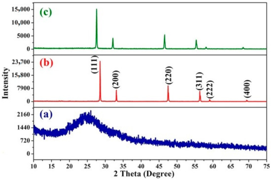 The XRD spectra of PPy, CeO2 NPs and PPy/CeO2 are displayed in Figure 3. In PPy (Figure 3a), the broad band between 2θ = 20–30°, having a maximum at 2θ = 24.87° showed pyrrole was successfully polymerized to PPy. The broad also confirms that PPy was amorphous in nature [17,23,24].