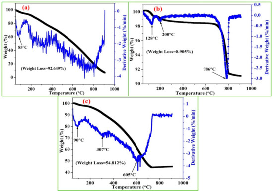 The TGA curve of PPy, CeO2 NPs, and PPy/CeO2 are displayed in Figure 5. In the case of PPy (Figure 5a), the first weight loss at 85 °C is due to the loss of water in form of moisture. The observed subsequent regular weight loss at higher temperatures is related to dopant loss and degradation of the PPy matrix [23,24]. The total weight loss was found to be 92.649%.