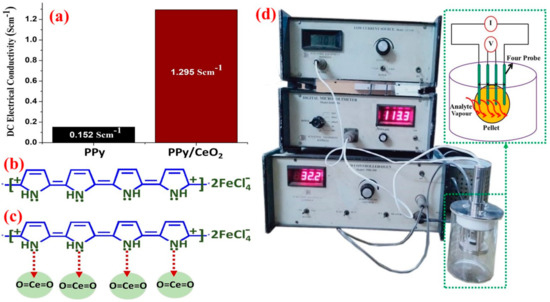 Initial conductivity of: (a) PPy and PPy/CeO2, (b) charge carriers of PPy generated due to oxidation/doping, (c) the interaction of PPy chain with CeO2 NPs leading to the formation of more efficient electronic paths needed for conductivity enhancement, and (d) instrumental setup used in conductivity and sensing experiments.