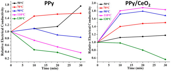 PPy exhibited good semiconducting properties, i.e., increase in conductivity with increasing temperature for only one cycles (Figure 8). In the second cycle, conductivity increased only up to 70 °C; after that, a slight decline was observed. For the third and fourth cycle, conductivity decreased continuously with increasing temperature due to loss of dopant as well as degradation of PPy [23,24]. However, PPy/CeO2 showed better stability as compared to pristine PPy. PPy/CeO2 was found to be stable in all four cycles. PPy/CeO2 showed the gain in conductivity for all four cycles which may be due to greater mobility of charge carriers at elevated temperatures (Figure 8). However, gain in conductivity in the first cycle was not as much as all three following cycles. Most importantly, for the second, third, and fourth cycles, the gain in conductivity showed an almost similar trend showing good conductivity retention ability of PPy/CeO2.
