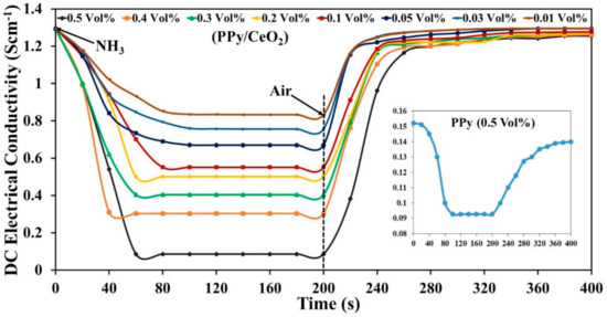 Ammonia vapor sensing characteristics PPy and PPy/CeO2 sensor pellets were evaluated in terms of various parameters, for example, % sensing response, response time, recovery time, reversibility, selectivity, and stability at room temperature. In the end, a sensing mechanism was also proposed. To determine the effect of ammonia vapors on the electrical conductivity of sensors, first of all, the selected sensor pellet was firmly connected with the probe of the device. Then, it was kept in a closed chamber containing ammonia solutions of known concentration (Figure 6d). The pellet was exposed in ammonia vapor for 200 s for the adsorption of ammonia molecules on the sensor surface and variation in the conductivity was recorded. After that, the sensor pellet was removed from the chamber and kept in the ambient air for 200 s. A sudden and regular decrease in the sensor’s conductivity was detected in ammonia vapor, which became constant after some time. Whereas in the air, the conductivity of the sensor started to increase and became saturated (Figure 9). The % sensing response of PPy and PPy/CeO2 based sensors was evaluated by employing the formula