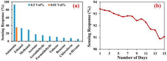 To determine the selectivity of the PPy/CeO2 based sensor towards ammonia vapor at 0.5 vol % and 0.01 vol %, its sensing response was also calculated in the presence of several other volatile organic compounds (VOCs). The % sensing response was calculated at 0.5 vol % concentration of ethanol, methanol, acetone, acetaldehyde, formaldehyde. Whereas toluene, benzene, chloroform, and n-hexane were utilized as received in the experiment. The % sensing response was found to 93.4%, 33.1%, 29.3%, 17.9%, 15.4%, 12.6%, 10.5%, 8.8%, 8.1%, and 5.8% towards ammonia, ethanol, methanol, acetone, acetaldehyde, formaldehyde, toluene, benzene, chloroform, and n-hexane, respectively (Figure 13a). Whereas, at 0.01 vol %, the sensor only responded towards ammonia vapors which showed that sensor was exclusively selective for ammonia (Figure 13a). Due to different electron-donating tendency as well as the rate of vaporization, all the tested VOCs here adsorbed to a different extent on the sensor-surface. Therefore, they interact differently with charge carriers and hence showed varying sensing response. Among all VOCs here, ammonia has the greatest electron-donating tendency along with a very high evaporation rate. Therefore, it neutralizes a large number of charge carriers which significantly reduce charge density and ultimately triggering the highest decrease in conductivity as compared to other VOCs. Thus, the PPy/CeO2 based sensor displayed outstanding selectivity to ammonia vapor as compared to different VOCs tested.