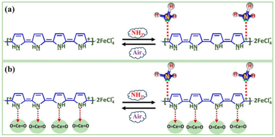 Proposed ammonia vapor sensing mechanism is showing the electronic interaction of ammonia molecules with the charge carriers of: (a) PPy and (b) PPy/CeO2 based sensor pellets.