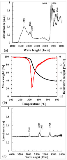 (a) ATR spectrum of WB fibers, (b) TGA and DTA curves of dried WB fibers, and (c) FT-IR spectrum of degradative products released by WB fibers at Tpeak (328.6 °C).