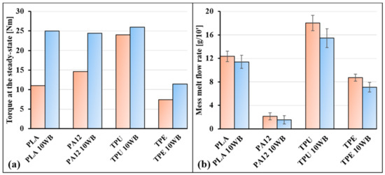 (a) Torque values recorded at the steady state during the internal-mixer processing and (b) mass melt flow rate (MFR) values of the WB-based samples.