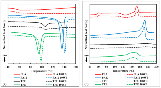 where and are the melting and post-crystallization enthalpies, respectively, of the samples evaluated during the second heating cycle; is the polymer weight fraction; and is the melting enthalpy of the fully crystalline polymer. The of PLA and PA12 were considered to be 93 J g−1 [24,25] and 209.2 J g−1 [26,27], respectively. In the case of TPE- and TPU-based composites, because of the lack of information concerning the of the neat polymers, the variation in crystallinity due to the addition of WB fibers was calculated as follows:
