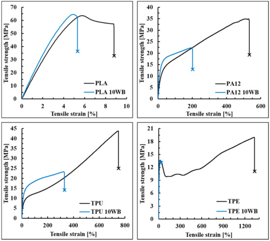 From a chemical point of view, these morphological and mechanical behaviors are connected with the chemical structure of the investigated polymers. In particular, hydrophilic WB fibers are able to interact significantly with the polar ester groups of PLA to partially interact with the polar urethane groups of TPU [46] and with the polar amide linkages of PA12 [47] and to poorly join with non-polar TPE.