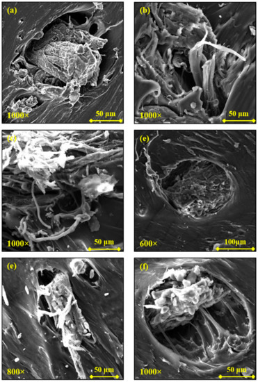 In the case of PLA, the excellent dispersion and distribution is also due to the fact that WB fibers appear de-fibered and branched in nanofibers, which therefore occupy the polymer matrix better and more uniformly. These tiny WB fibers are depicted in Figure 7, from which it can also be noticed how they are perfectly bonded with the polymer (Figure 7c), since the decrease in the fiber diameter enhances the fiber–matrix interface and the fiber wettability [45].