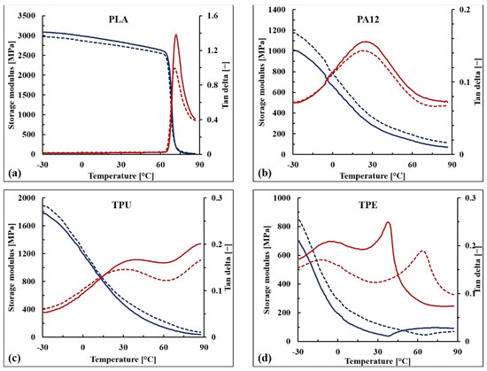 Dynamic mechanical analysis (DMA) of PLA (a), PA12 (b), TPU (c), and TPE (d) samples. Blue and red curves refer to the storage modulus (E’) and the damping factor (tan δ), respectively; meanwhile, the solid and dotted lines indicate the properties of the neat polymer and the corresponding WB-based composite, respectively.