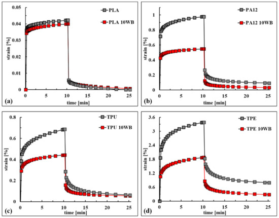 From an overall point of view, the values of PLA-, PA12-, TPU-, and TPE-based composites reduced0 by the addition of around 5%, 44%, 35%, and 44% WB fibers, respectively, compared with neat polymers. In addition, the lowered creep compliance was also maintained for time tending to infinity (), indicating the ability of WB fibers to improve the creep resistance for both short and long times.