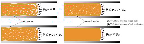 Systematic studies of gas counter-pressure effect on the MuCell process and conventional injection were carried out by Chen et al. [22,24,26,27,28]. The use of gas counter-pressure (GCP) at the melt front during the filling process can suppress the fountain flow effect and minimize the foaming bubbles being drawn to the part surface. This GCP effect was also useful in minimizing surface fiber orientation in injection and melt-powder separation in powder injection molding [27,28,29]. When the employed gas counter-pressure is higher than the critical pressure of the supercritical fluid, the dissolved SCF in melt remains in the SCF state and no foaming occurs in the filling stage. A schematic of GCP restricting foaming is presented in Figure 1.