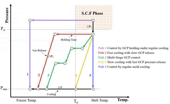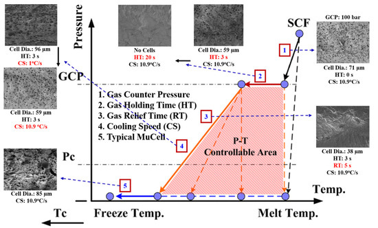 In this study, a new concept of P(pressure)-T(temperature) (P-T) path control was employed for foaming control of MuCell parts (Figure 2). Most earlier studies on foaming control were conducted either by varying mold cavity temperatures [14,15,16,17,26] or by varying pressure alone [23,24] at a fixed mold temperature. Our study proposed an approach of sequential and/or simultaneous combined control of both pressure and temperature. We hope this approach can provide an effective and broad way of controlling foaming bubble sizes and the associated properties. Therefore, we extended this concept by incorporating additional parameters, namely, gas pressure holding time and release time, and considering the mold cooling speed (rather than mold temperature) to form a P-T path in the SCF PT diagram. Different parameter combinations constitute various PT paths. The foaming process is a pressure and temperature-driven reaction; therefore, different paths are expected to result in different foaming morphologies.