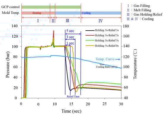 An Arburg 420C injection molding machine equipped with a suitable screw for SCF dissolved in melt and a supercritical fluid generation/transportation system was used to conduct the MuCell process and inject molding foaming parts. A homemade gas pressure regulation unit installed with a high-frequency gas control valve was built and connected to the mold. The real-time gas pressure inside the mold cavity was monitored and adjusted by a Cavity pressure sensor (PRIAMUS 8102C). The system schematic is shown in Figure 3 [24]. For mold temperature control, two units were used sequentially, one for rapid heating and the other for rapid cooling, also shown in Figure 3. To achieve the cooling rate control, three mold blocks (one used single QC-10 aluminum, the other used single M333 steel, and the third block used both as composite) were designed and employed. This design enables the cooling rate control varying from 0.8 °C/s to10.9 °C/s in the mold temperature range of 90 °C to 120 °C. The molded part geometry and the associated mold cooling inert block are illustrated in Figure 4 [26]. Details have been described earlier [26]. The capability of gas counter-pressure control was also extended; instead of a fixed pressure value combined with the holding time, the gas pressure value could be decreased (released) to zero in a certain period (relief time) or via a multi-stage operation resulting in different pressure relief speeds. Various combinations of cooling speed and GCP relief speed created different P-T paths and possible variations of foaming morphology. The operation schematic is shown in Figure 2. The typically measured pressure and temperature profiles are illustrated in Figure 5 [24]. Before melt filling started, the pressure sensor measured the gas counter-pressure value-filled inside the cavity. Once melt advanced and passed the embedded pressure sensor, the pressure sensor measured the melt pressure which was higher than the GCP. It is because the melt needs an additional pressure drop to move ahead against the counter-pressure built at the melt front. Hence, the pressure curve shows a bump. Once the melt filled the cavity and stopped moving, the melt pressure returned to the GCP value. From the slope of the temperature variation, we could also calculate the cooling rate. The same situation was also applied to the gas pressure relief rate. The longer the relief time, the slower the GCP relief rate.