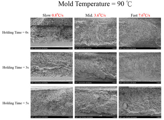 Effect of GCP holding time on foaming morphology under different cooling speeds at 90 °C mold temperature.