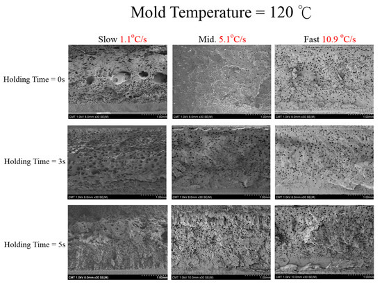Effect of GCP holding time on foaming morphology under different cooling speeds at 120 °C mold temperature.