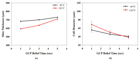 Effects of GCP relief time on sloid skin thickness and average foamed cell diameter. (a) Effects of GCP relief time on skin thickness, (b) effects of GCP relief time on foamed cell diameter.