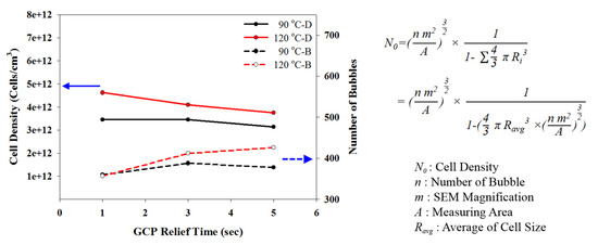 Effects of GCP relief time on foaming cell density. A schematic of cell density calculation from bubble numbers shown in the Scanning Electron Microscope photograph is also presented.