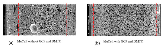 Relevant molding parameters for the MuCell, GCP, holding time, and release time are listed in Table 1. To measure the cell size and the solid frozen layer thickness, the field emission Scanning Electron microscope (Hitachi S-4800) was used. The average foamed size, as well as cell density, could then be calculated. A typical SEM image for measuring foaming bubbles is presented in Figure 6 [26]. The feasibility of the current approach was explored by a preliminary study for microcellular injection molding of thermoplastic elastomer TPU with/without GCP-based P-T control.