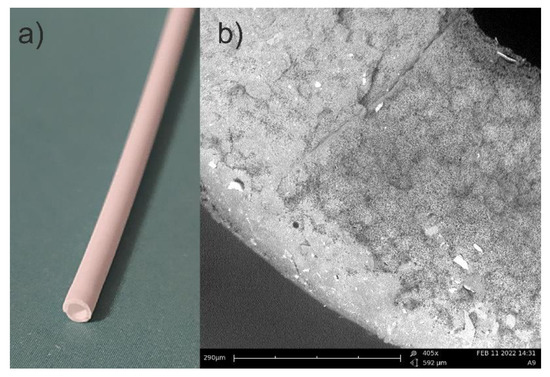 In Figure 2a, a photo, and in Figure 2b, a picture from the scanning electron microscopy (SEM) are presented. The SEM photo has been taken using PhenomPro device. A special holder for non-conductive samples has been used. This kind of holder allows for testing samples without coating them.
