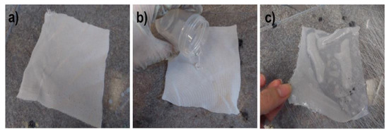 Preparation of PSi membranes for water vapor permeation studies. (a) Cotton squares 12 cm × 12 cm; (b) pouring PSi onto cotton fabric on a leveled glass plate; (c) samples ready for water vapor permeation studies.